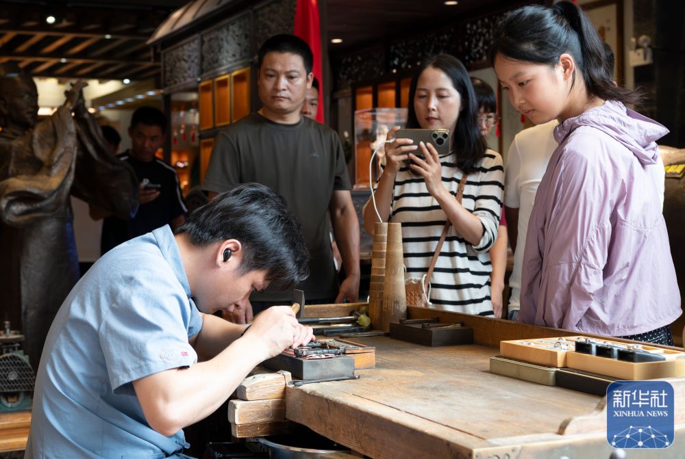 ↑ 10月6日,游客在福建省福州市三坊七巷的银饰品老铺里观看非遗手工技艺。新华社记者 魏培全 摄