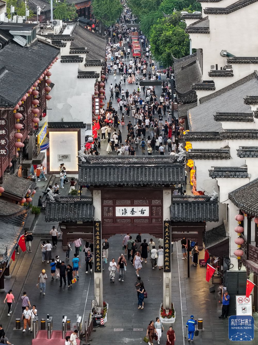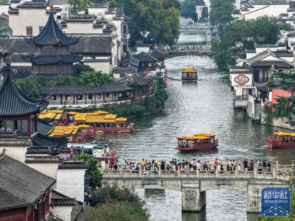 ↑ 10月7日,游客在江苏省南京市秦淮区的夫子庙景区休闲游玩(无人机照片)。新华社记者 李博 摄