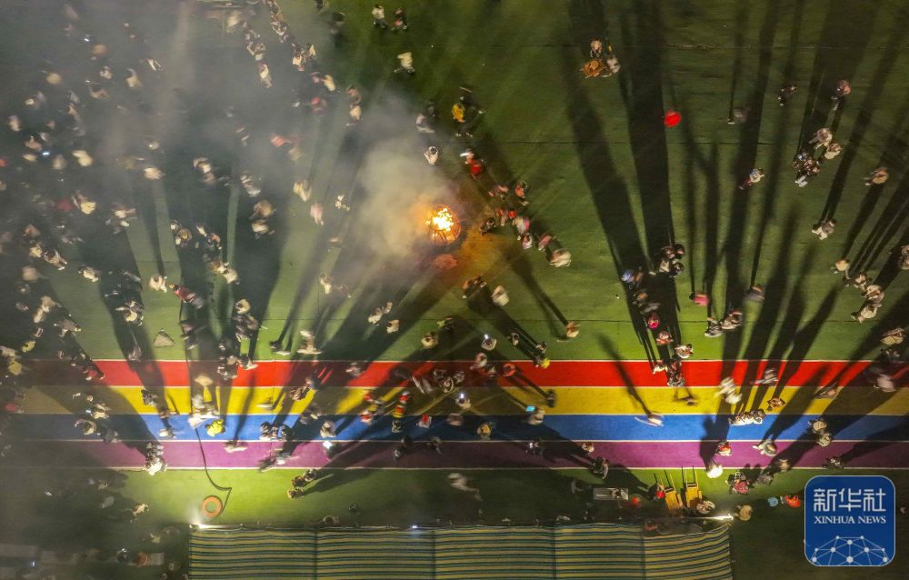 ↑ 10月6日晚,游客在河北省遵化市团瓢庄镇山里各庄村稻田画景区参加篝火晚会(无人机照片)。新华社发(刘满仓摄)