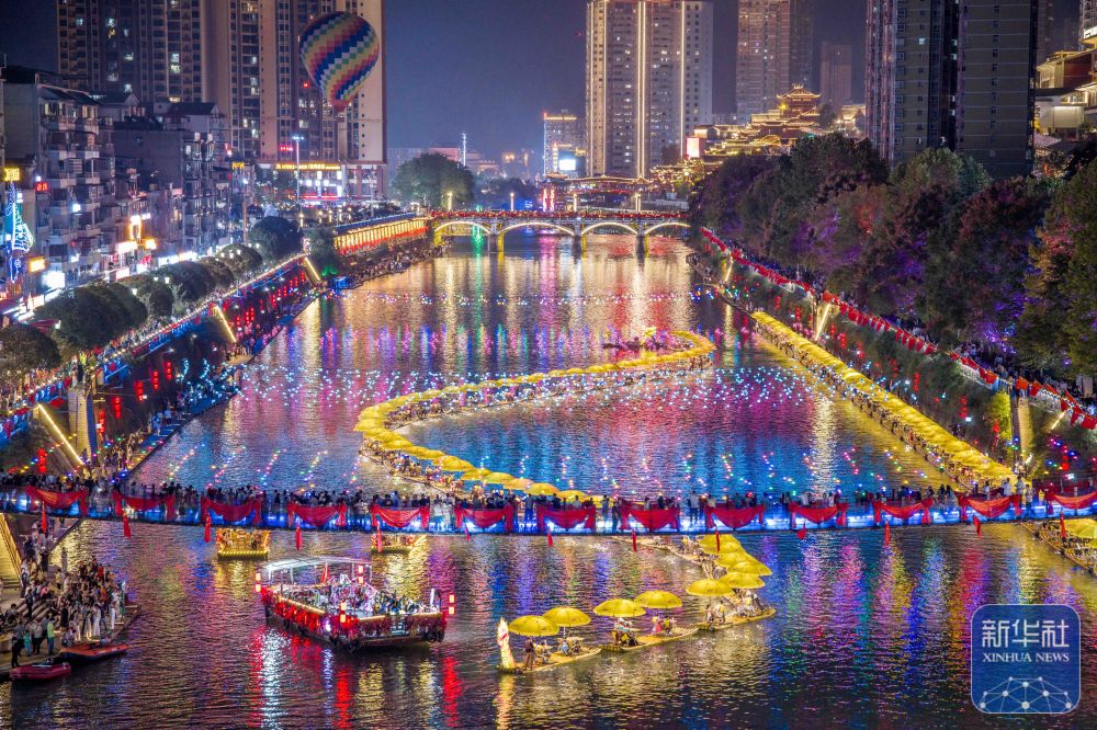 ↑ 10月6日晚,游客在湖北省宣恩县乘坐竹筏欣赏夜景(无人机照片)。新华社发(王法钧摄)