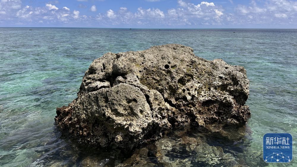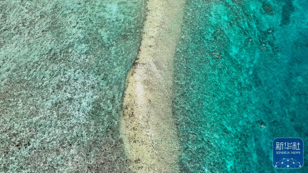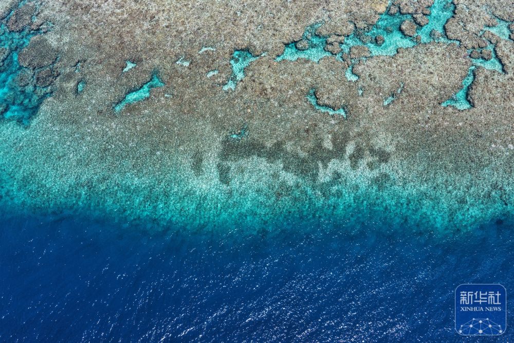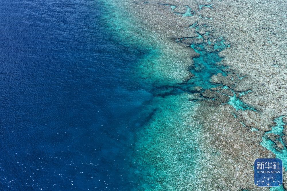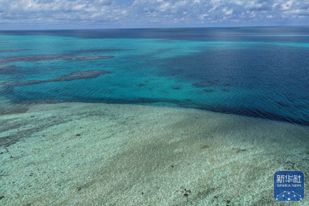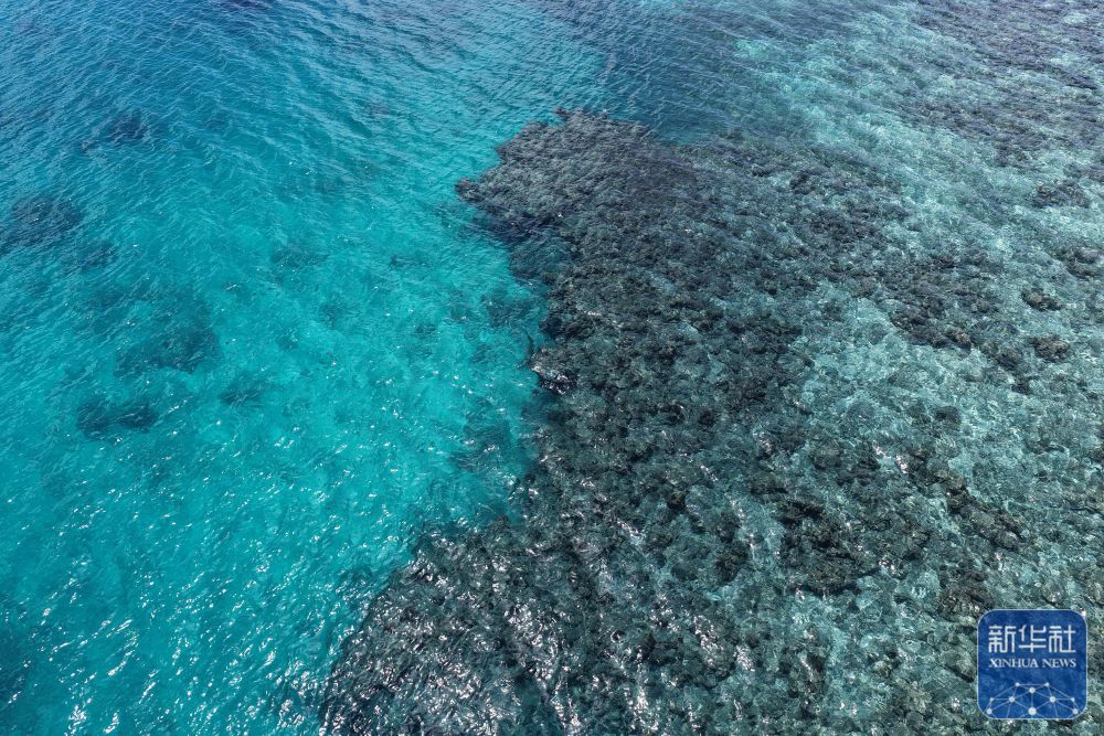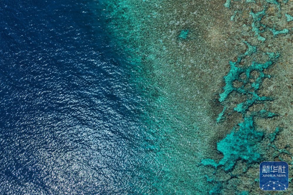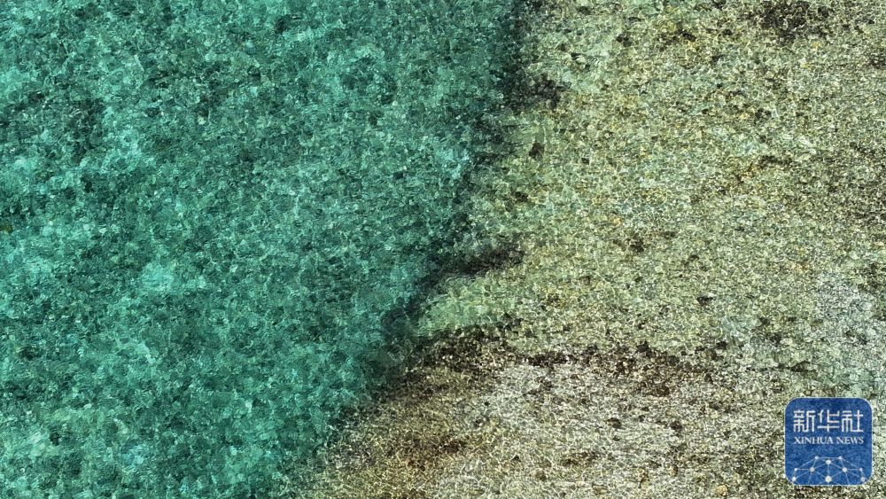 ↑10月2日拍摄的黄岩岛礁盘与潟湖接合处。新华社发