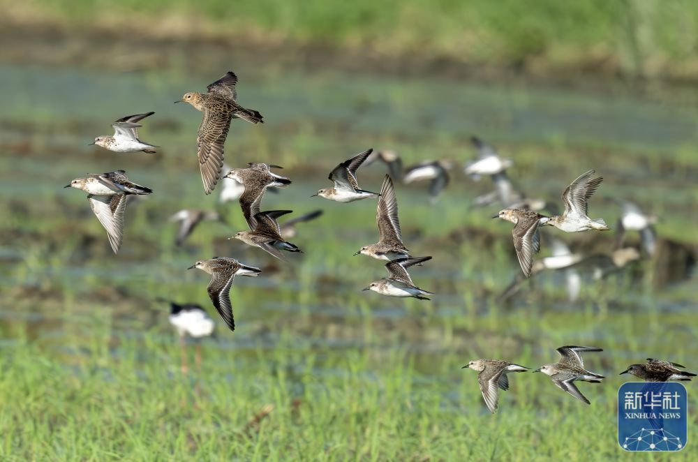 ↑ 一只黄胸滨鹬(左三)和水鸟在位于福建泉港与惠安辋川交界的农田的上空飞过(9月9日摄)。