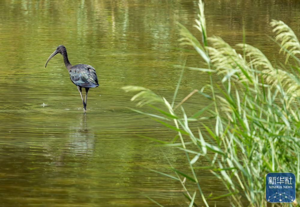 ↑ 在福州长乐闽江河口湿地,一只鹮鸟在觅食(10月4日摄)。