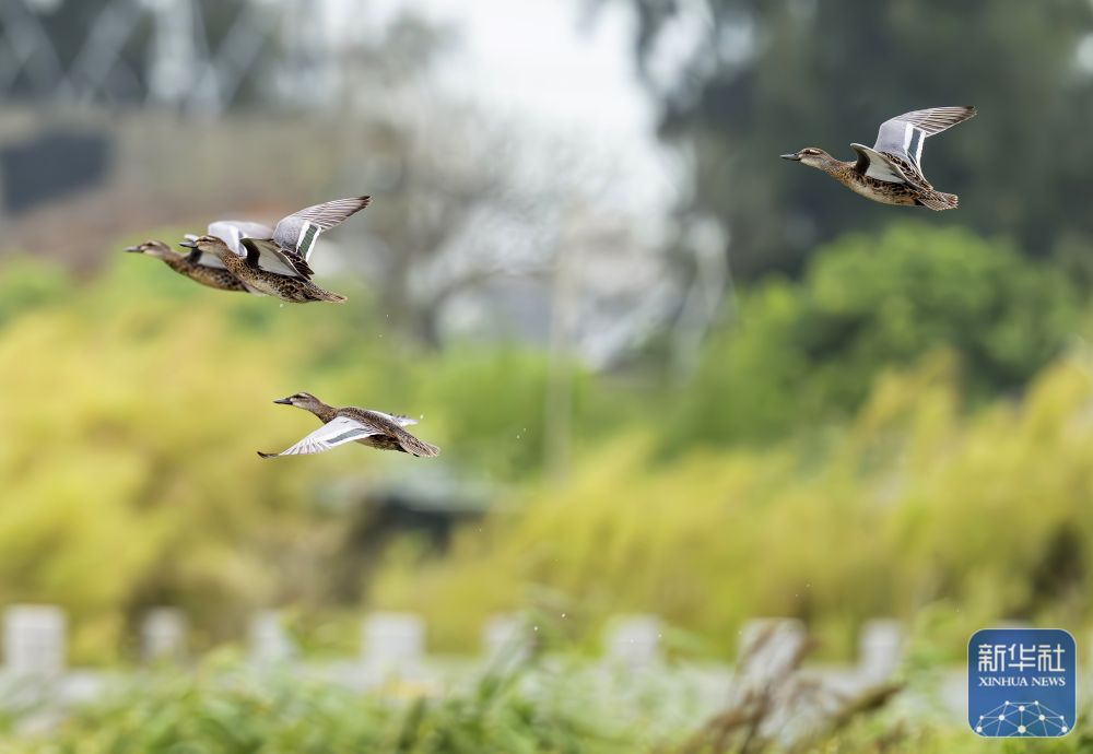 ↑ 在福州长乐下吴村,一群候鸟飞过湿地上空(9月24日摄)。