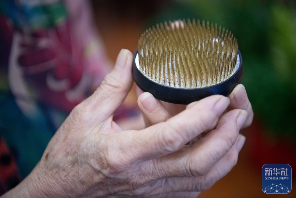 ↑ 9月29日,在安徽农业大学林学与园林学院徽派插花艺术传承基地,付玉兰展示插花固定用具“剑山”。