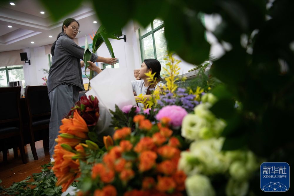 ↑ 9月30日,在安徽农业大学林学与园林学院,付玉兰(右)为在校老师讲解传统插花艺术的相关知识。