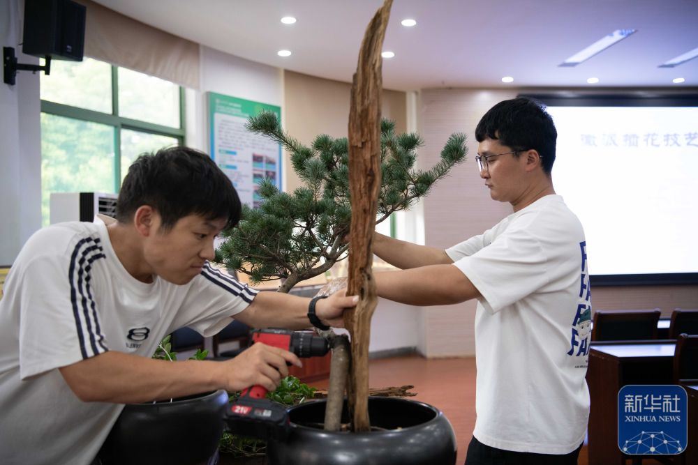 ↑ 9月30日,在安徽农业大学林学与园林学院徽派插花艺术传承基地,付玉兰(后)为在校师生讲授徽派插花艺术的相关知识。