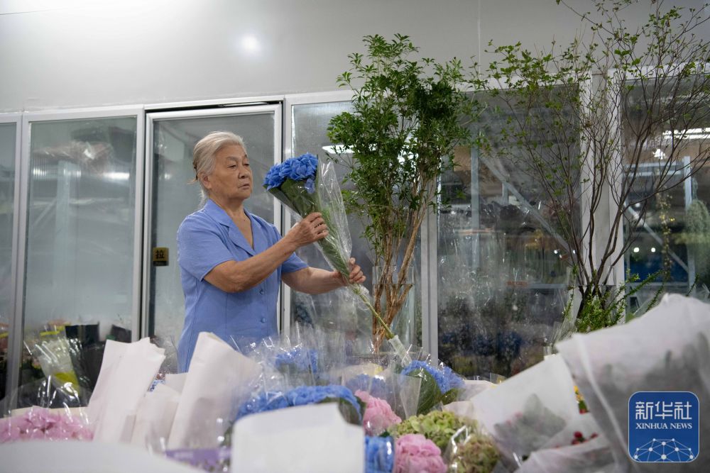 ↑ 10月10日,在位于安徽合肥的一家花店,付玉兰挑选用于插花创作的花材。