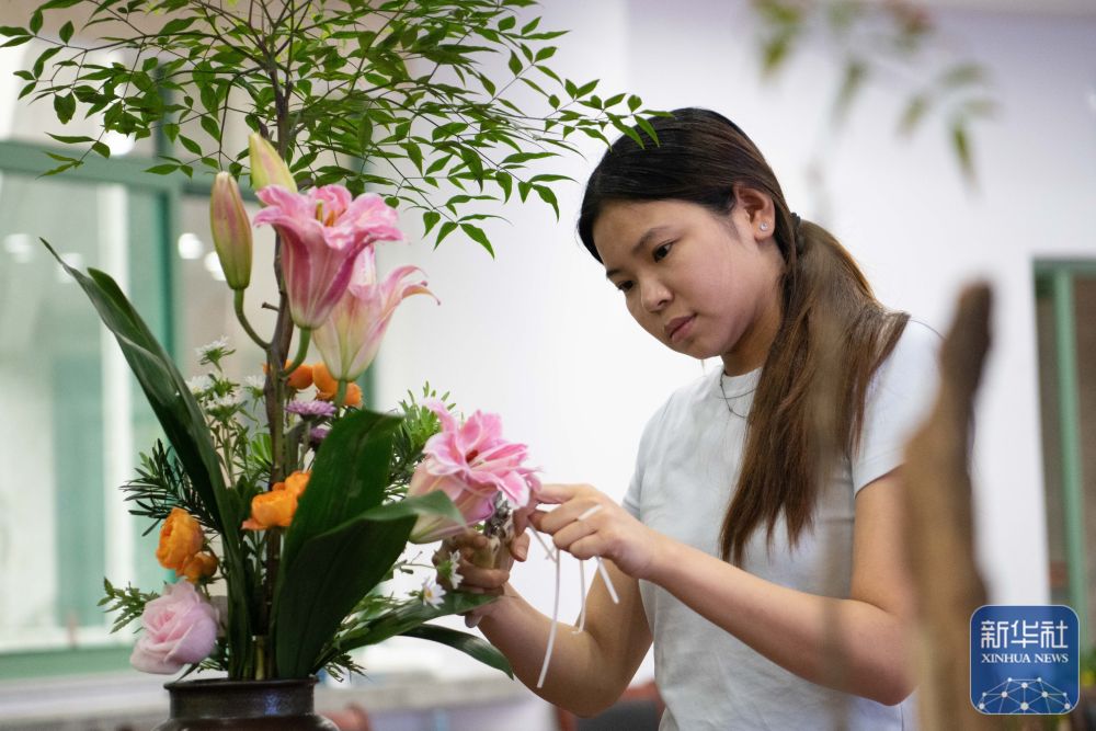 ↑ 9月29日,在安徽农业大学林学与园林学院徽派插花艺术传承基地,徽派插花艺术传承团队成员进行插花艺术创作。