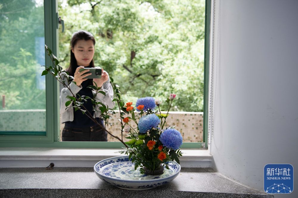 ↑ 9月30日,在安徽农业大学林学与园林学院徽派插花艺术传承基地,一名大学生在拍摄付玉兰创作的插花作品。