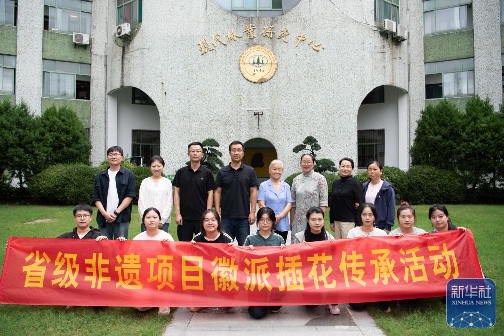 ↑ 9月30日,在安徽农业大学林学与园林学院,徽派插花艺术传承团队核心成员付玉兰(后排右四)与团队成员及在校师生合影留念。