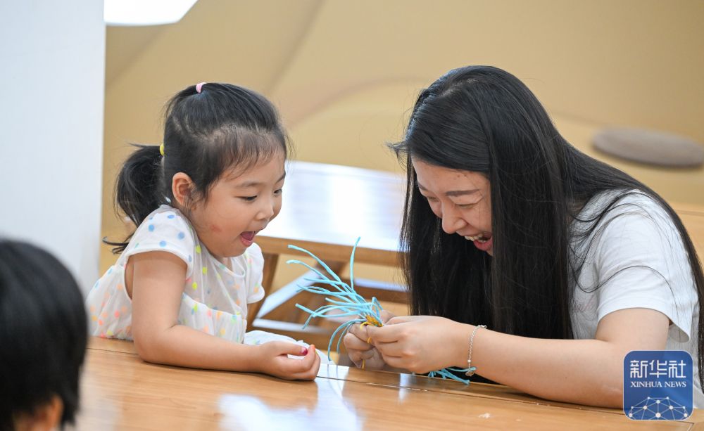 ↑ 10月12日,在海南省文化馆,东山草编技艺传承人袁洁(后)为家长和小朋友讲解东山草编技艺。