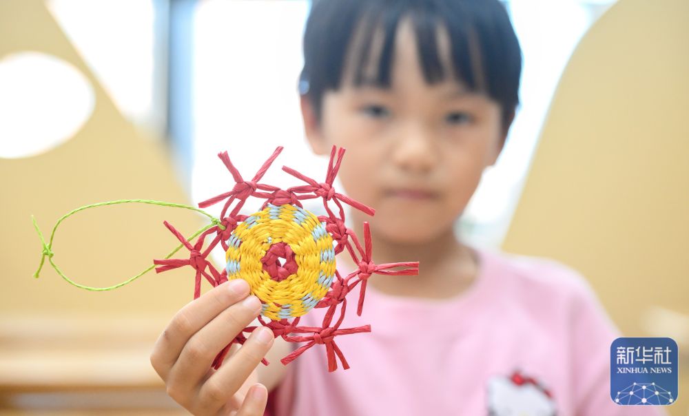 ↑ 10月12日,在海南省文化馆,小朋友展示自己的东山草编技艺作品。