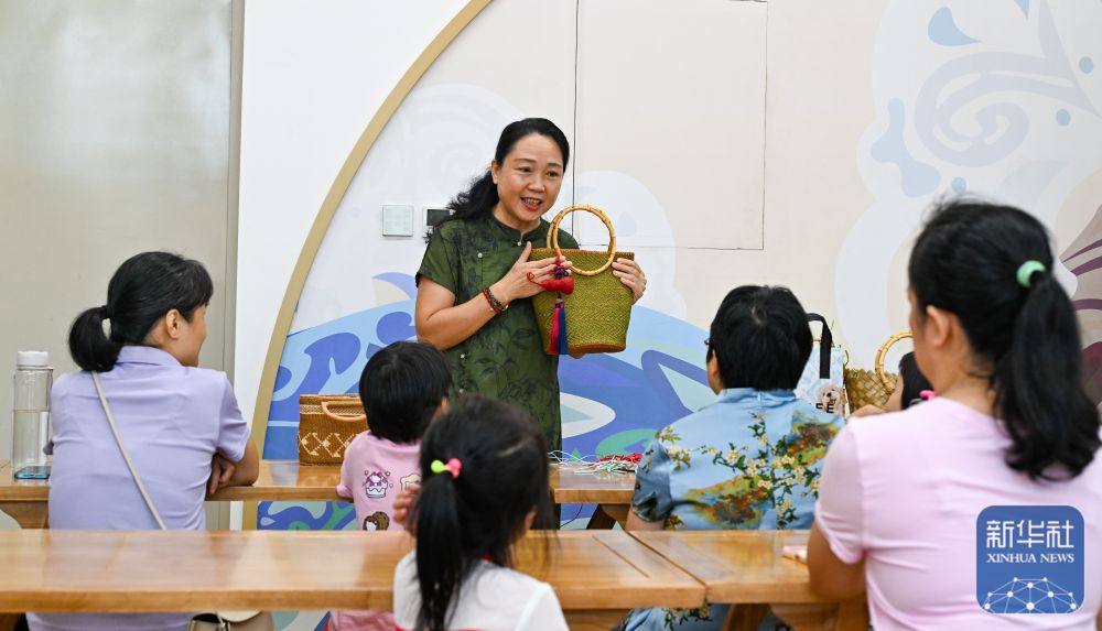 ↑ 10月12日,在海南省文化馆,东山草编技艺传承人袁洁(后中)为家长和小朋友们讲解东山草编技艺。