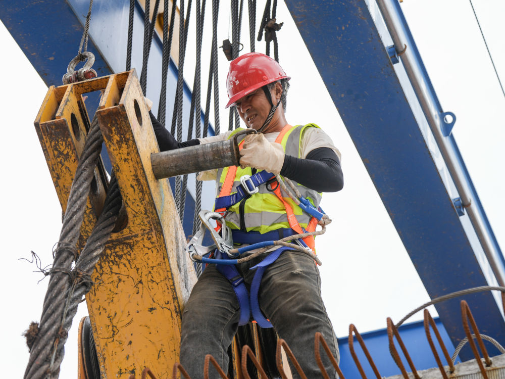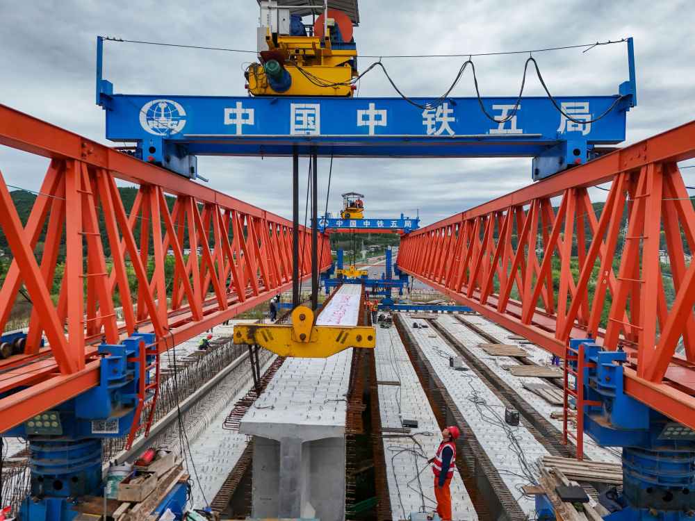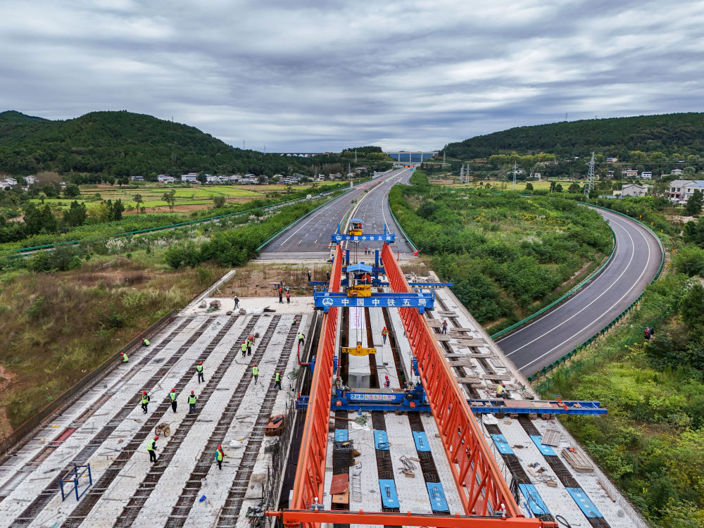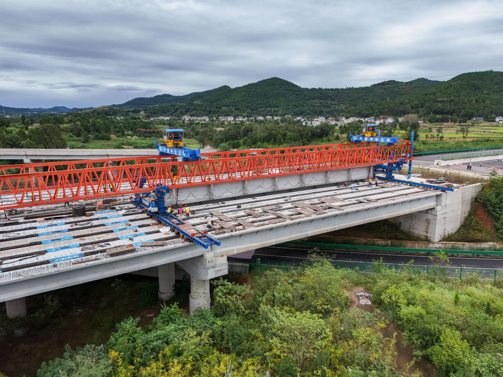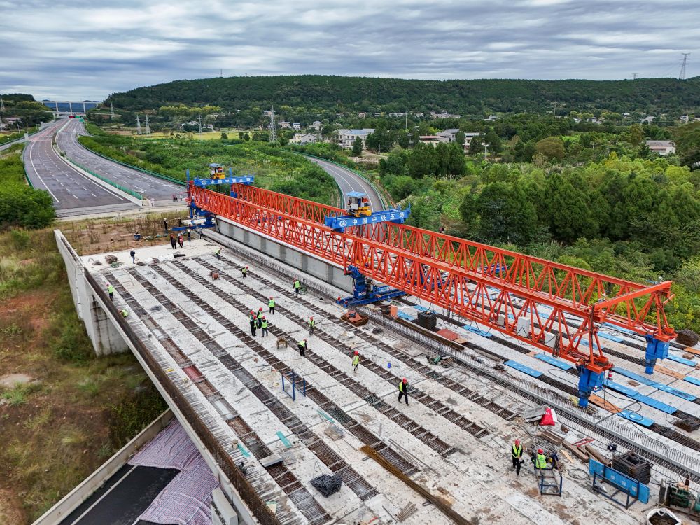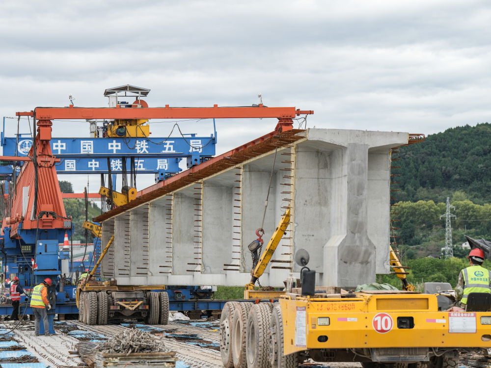 10月12日,在京昆高速广元至绵阳段扩容工程牛头河大桥,工人在进行架梁作业。