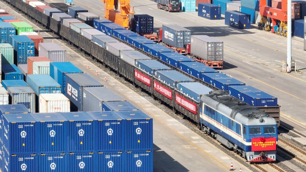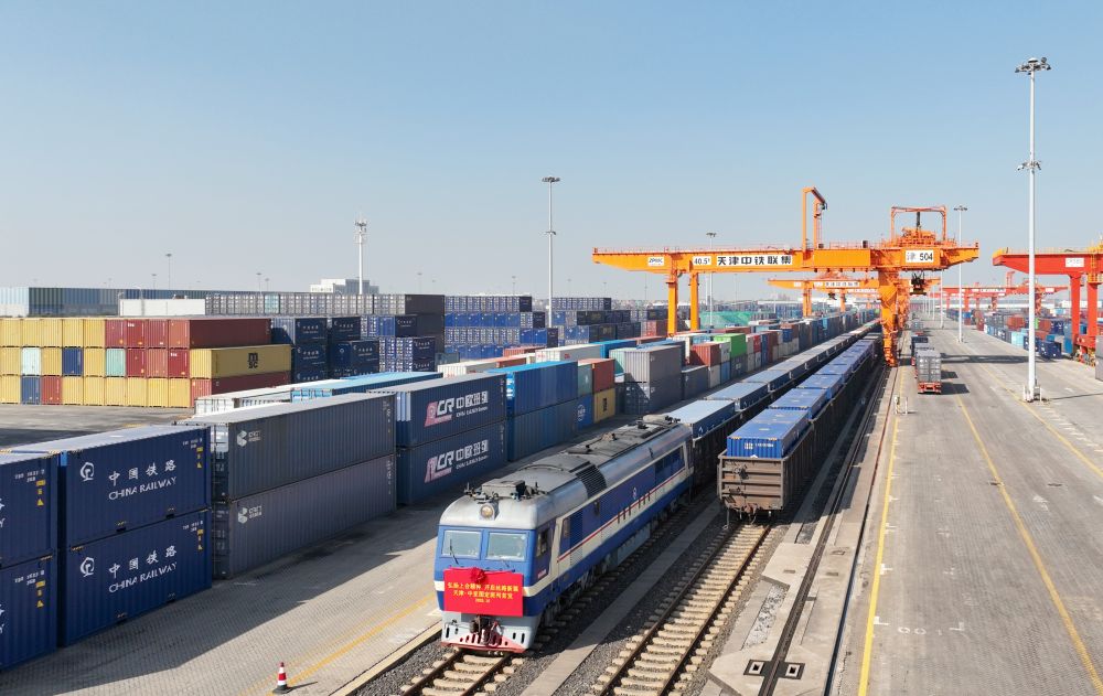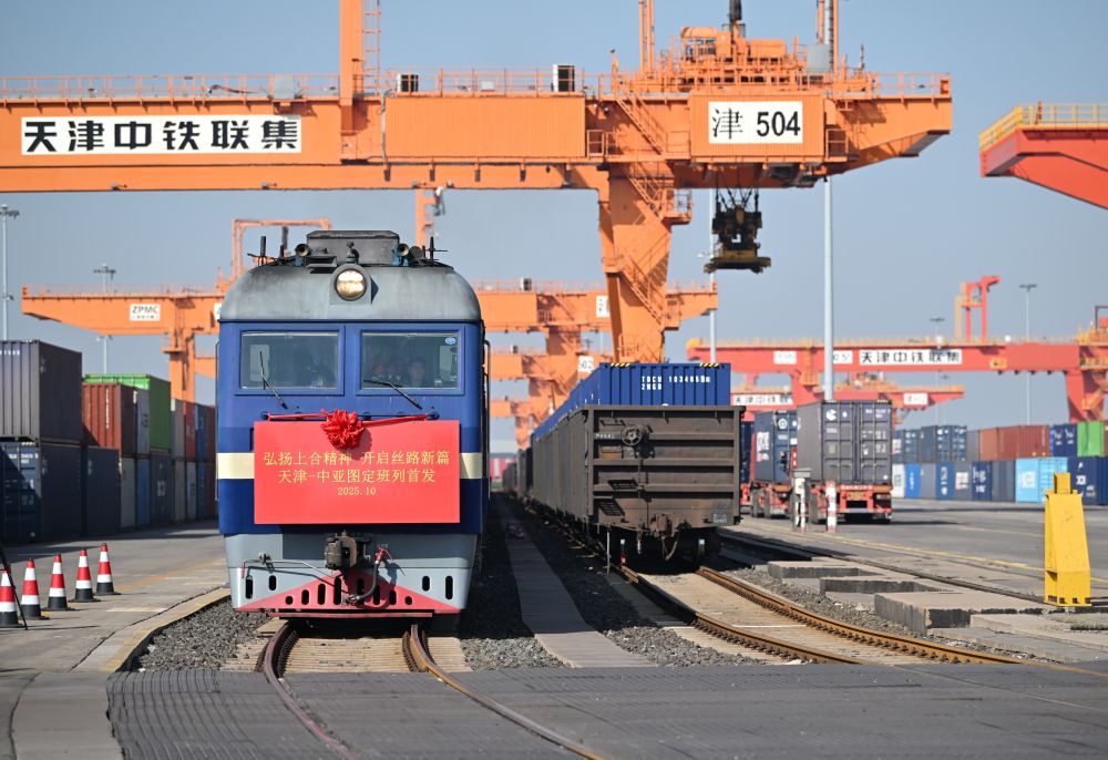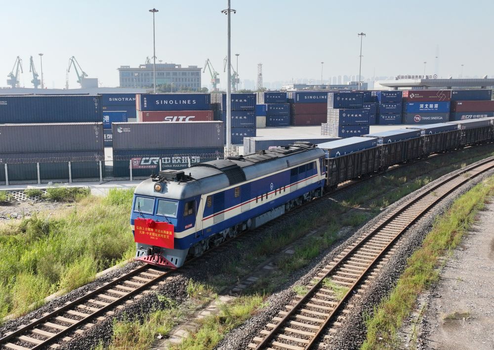 10月13日,伴随嘹亮悠长的鸣笛声,一列满载家电产品、汽车配件等货物的中亚班列从中铁天津集装箱中心站出发,将经由霍尔果斯口岸出境,驶向哈萨克斯坦等地。
