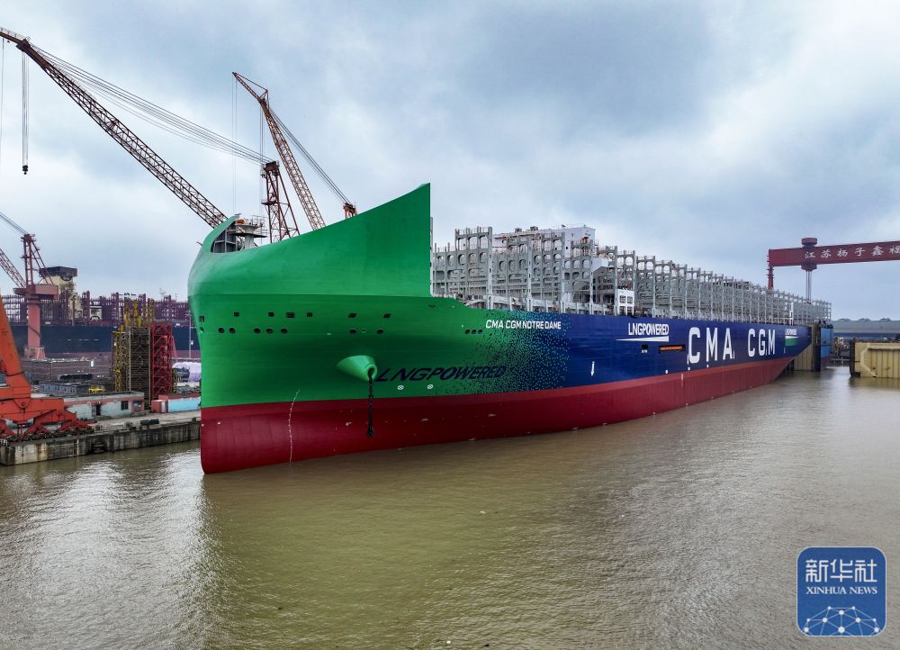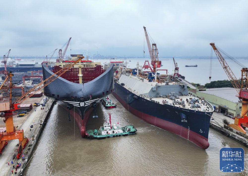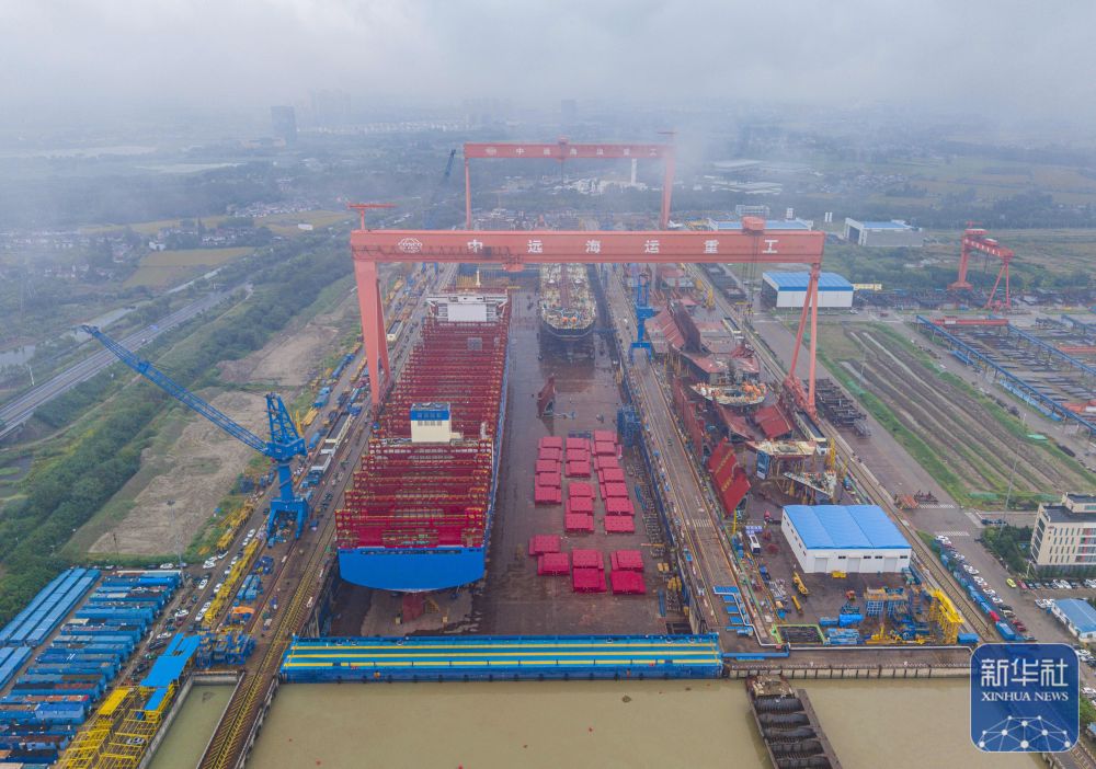 ↑ 10月14日拍摄的位于江苏省泰兴市的江苏扬子鑫福造船有限公司船坞内建造的大型船舶(无人机照片)。新华社发(顾继红摄)