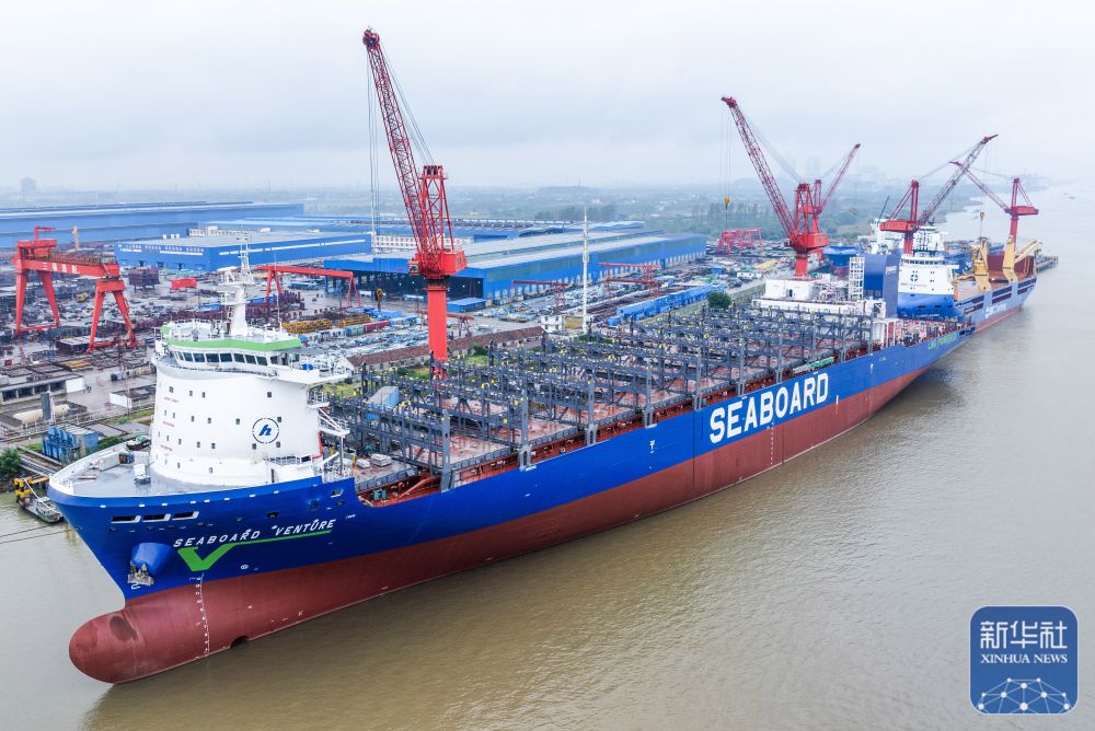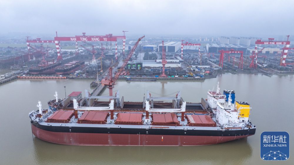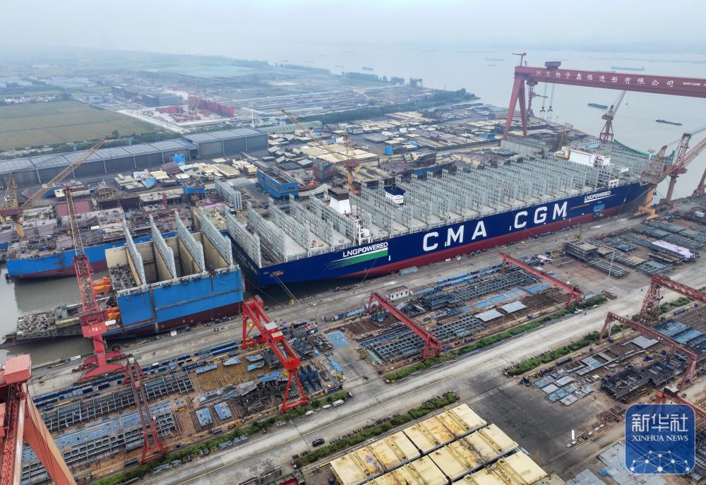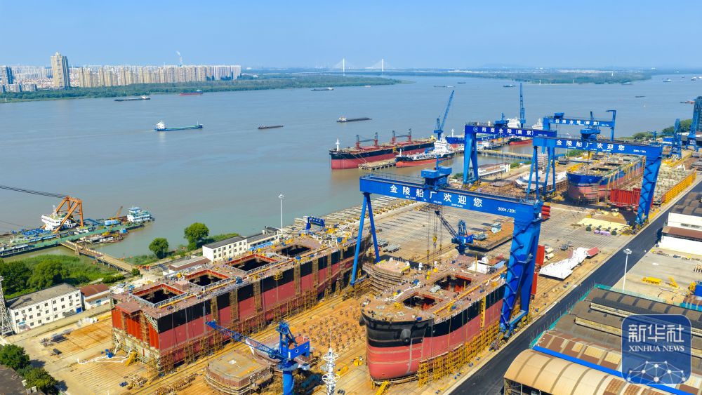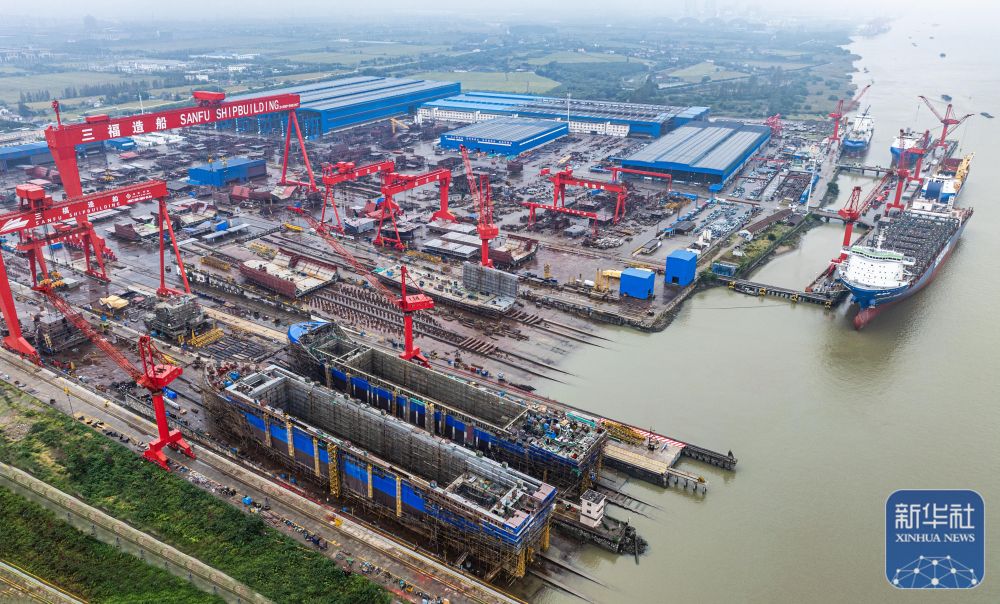 ↑ 10月14日拍摄的位于江苏省泰兴市的江苏扬子鑫福造船有限公司生产区及船坞场景(无人机照片)。新华社发(顾继红摄)