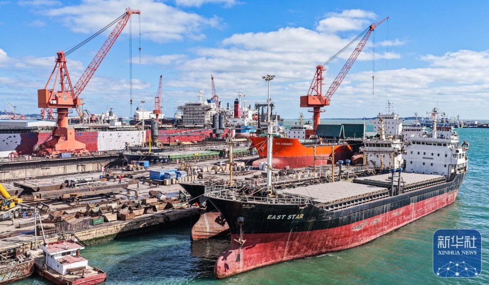 ↑ 10月14日,在山东省荣成市石岛管理区修造船产业基地,工人们在加紧工作(无人机照片)。新华社发(李信君摄)