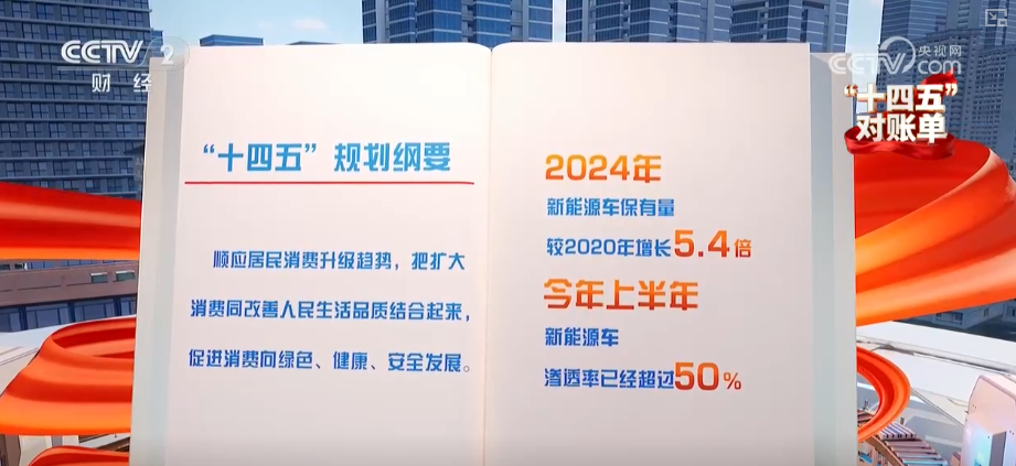 “十四五”规划纲要提出,顺应居民消费升级趋势,把扩大消费同改善人民生活品质结合起来,促进消费向绿色、健康、安全发展。2024年,新能源车保有量较2020年增长5.4倍,2025年上半年新能源车渗透率已经超过50%。截至上半年,以旧换新带动销售额2.9万亿元,约4亿人次享受补贴优惠。这五年,我国服务消费快速增长,2020—2024年,居民服务性消费支出年均增长9.6%,快于商品消费。