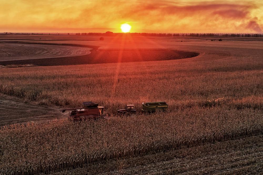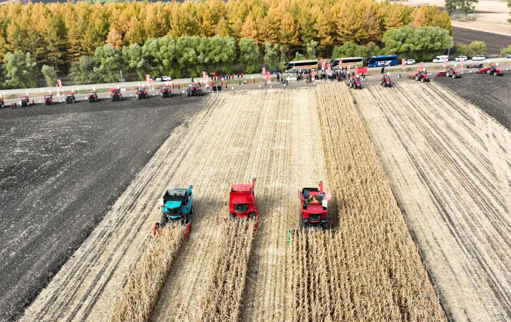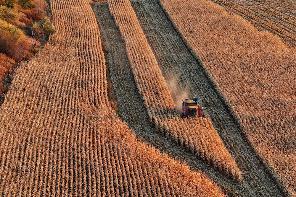 ↑ 10月13日,在北大荒集团黑龙江格球山农场有限公司玉米地块,大型农机在进行抢收作业(无人机照片)。新华社发(陆文祥摄)