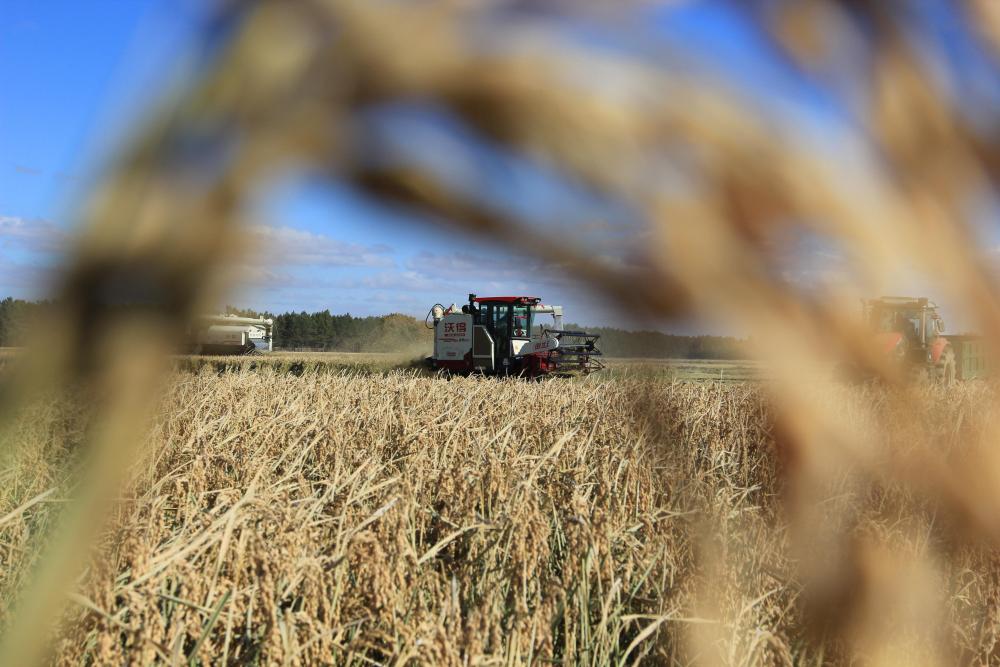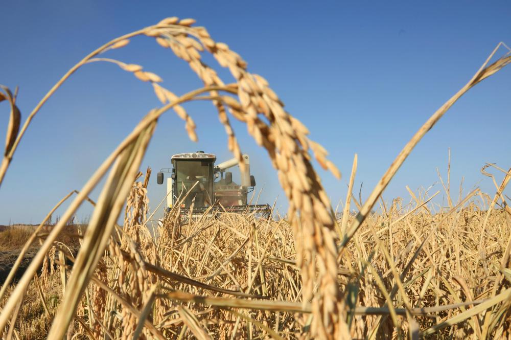 ↑ 10月13日,在北大荒集团黑龙江建设农场有限公司第四管理区,种植户驾驶收割机抢收水稻。新华社发(许颖献摄)