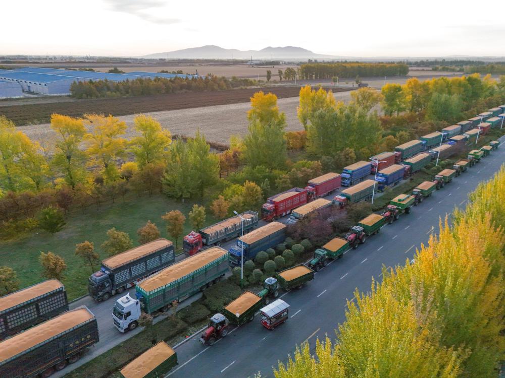 ↑ 10月15日,卖粮车在黑龙江省佳木斯市富锦市一粮食收储企业门前排队(无人机照片)。新华社发(曲玉宝摄)