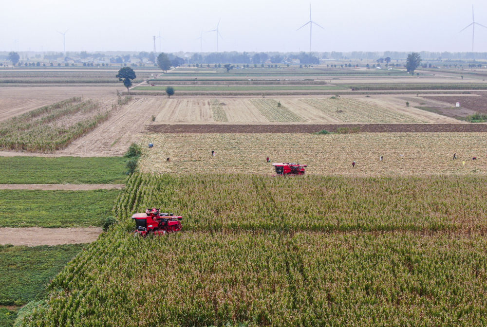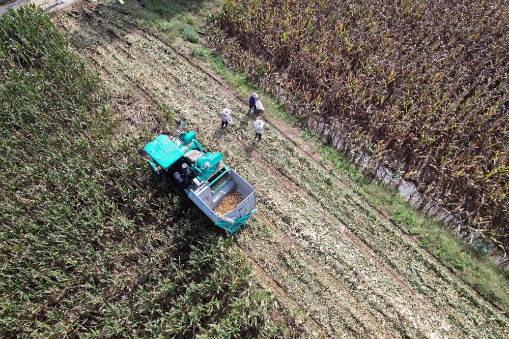 ↑ 10月14日,在河南省商丘市睢县董店街道曹庄村一处农田内,收割机在抢收玉米(无人机照片)。新华社发(徐泽源摄)