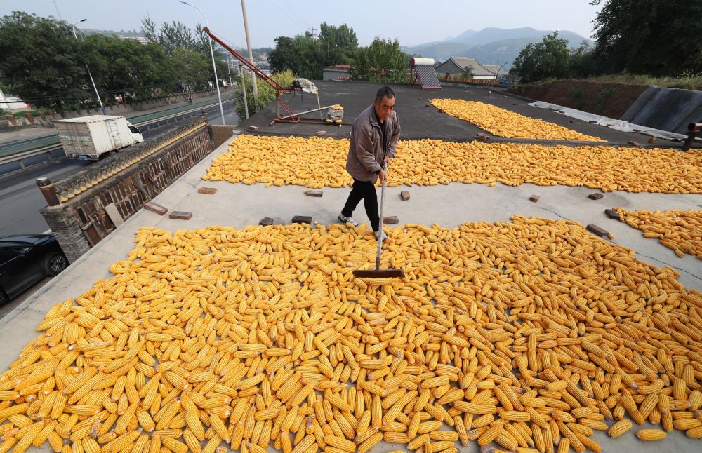 ↑ 10月15日,河北省石家庄市井陉县秀林镇南横口村村民在晾晒玉米。新华社发(梁子栋摄)