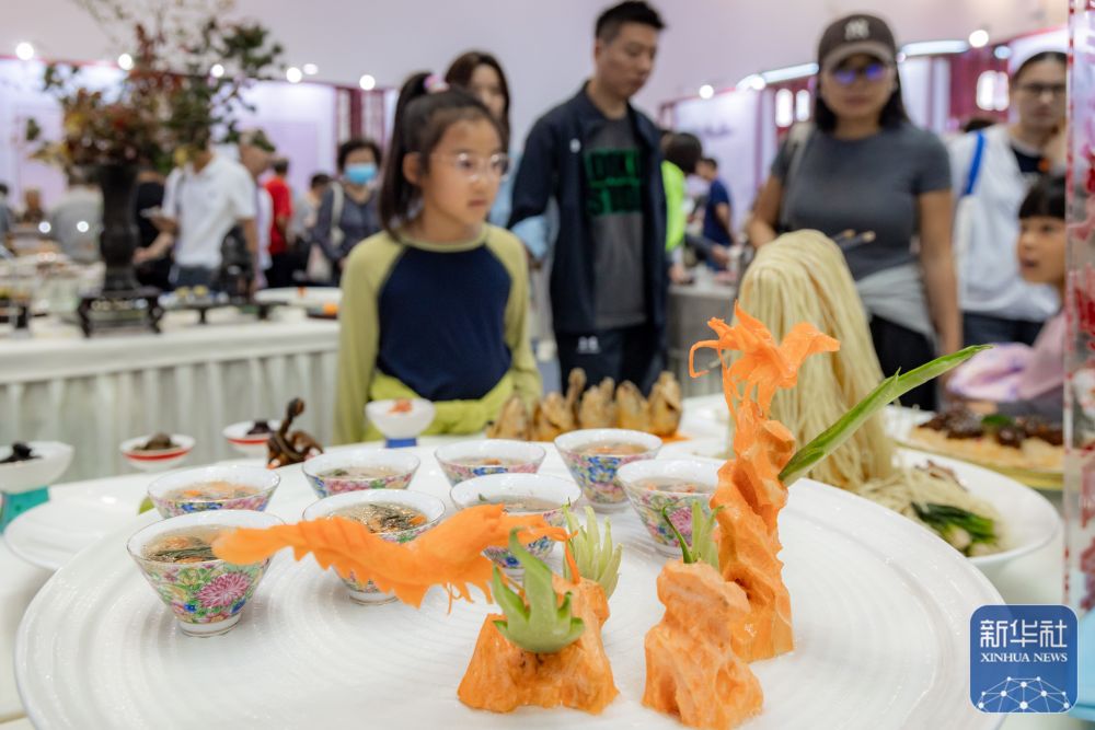 ↑10月18日,观众在博览会上观看展出的菜品。
