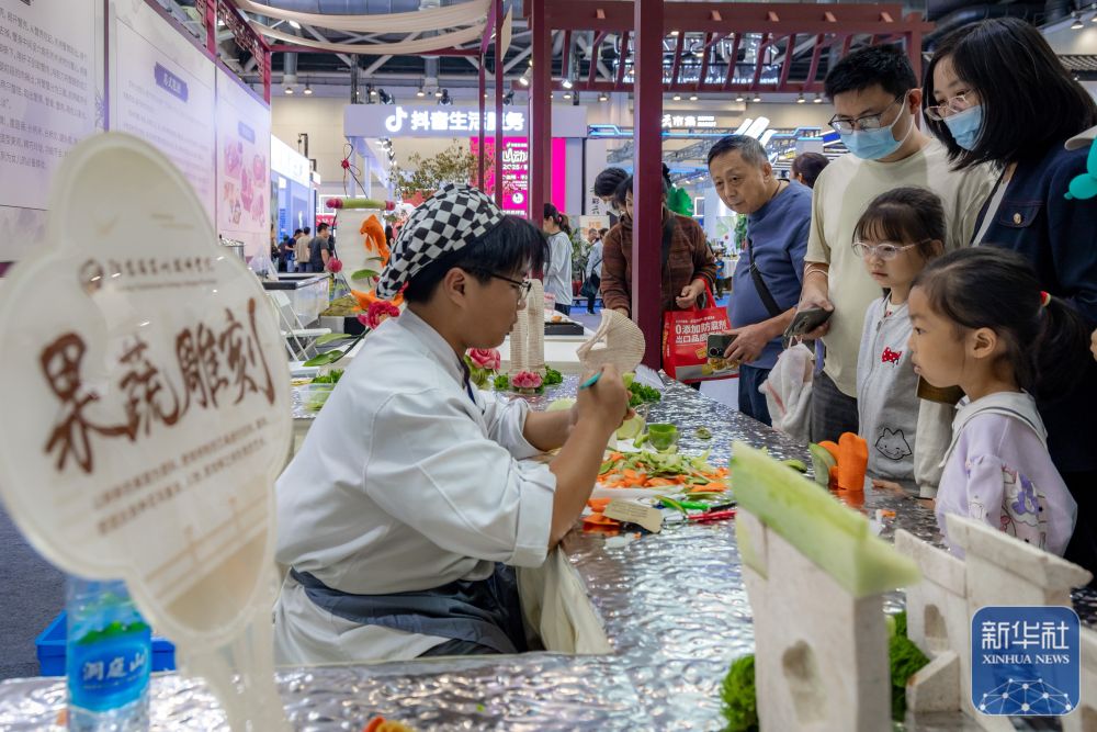 ↑10月18日,小朋友在博览会上观看果蔬雕刻演示。