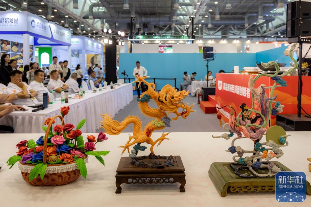 ↑10月18日拍摄的在厨艺绝技绝活展示会上展出的面塑作品。