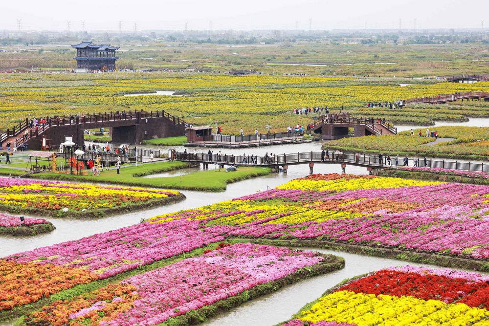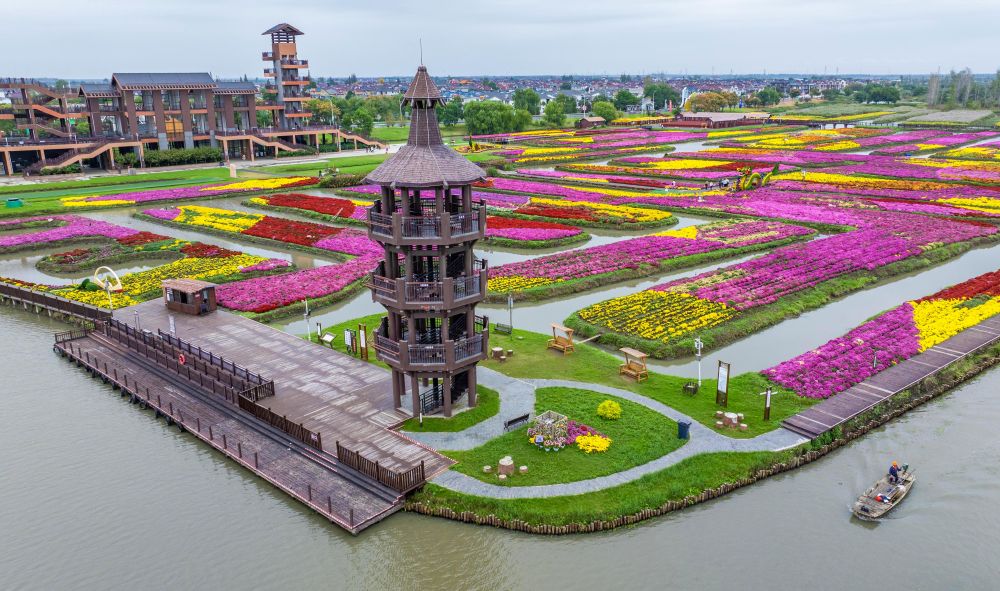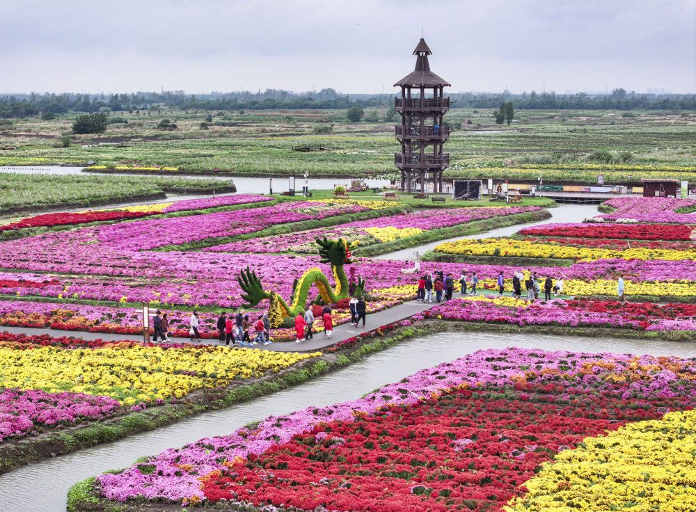 ↑ 10月17日,游客在江苏省兴化市千垛景区赏菊游玩(无人机照片)。新华社发(周社根 摄)