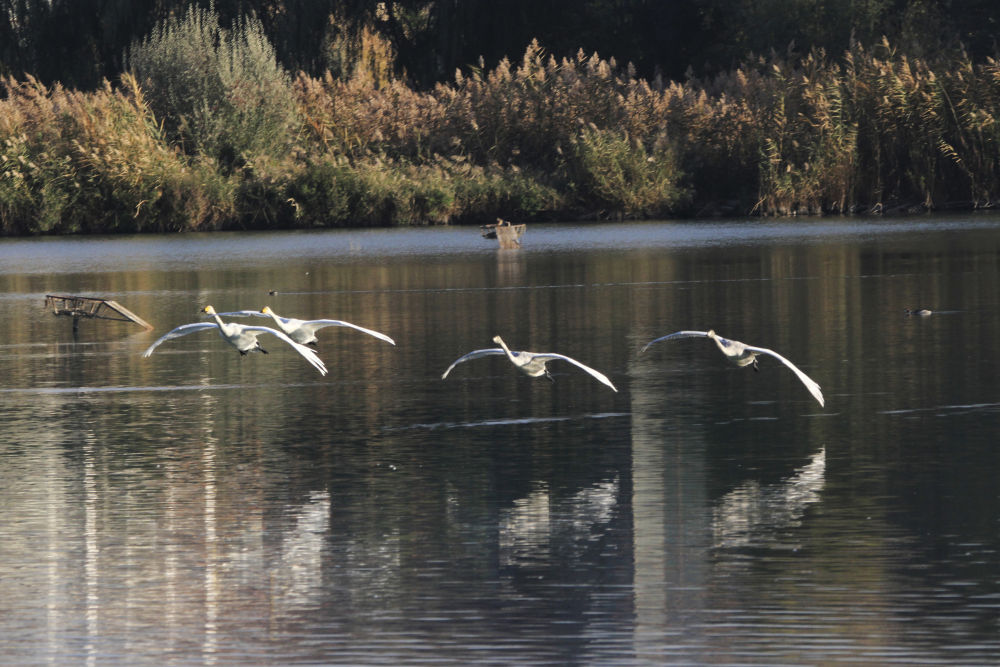 ↑ 10月17日在甘肃省张掖市国家湿地公园鹤影湖拍摄的白天鹅。新华社发(陈礼 摄)