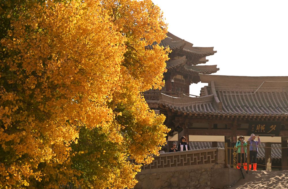 ↑ 10月18日,游客在甘肃省敦煌市鸣沙山月牙泉景区的胡杨前拍照。新华社发(张晓亮 摄)