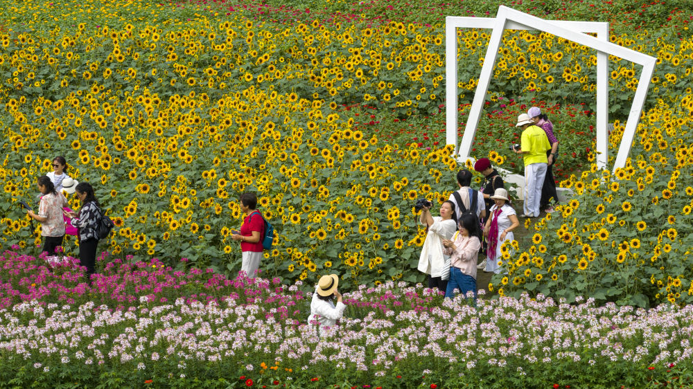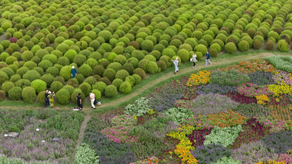 ↑ 10月17日,游客在江苏省昆山市开发区慧聚花海赏花游玩(无人机照片)。新华社发(王须中 摄)