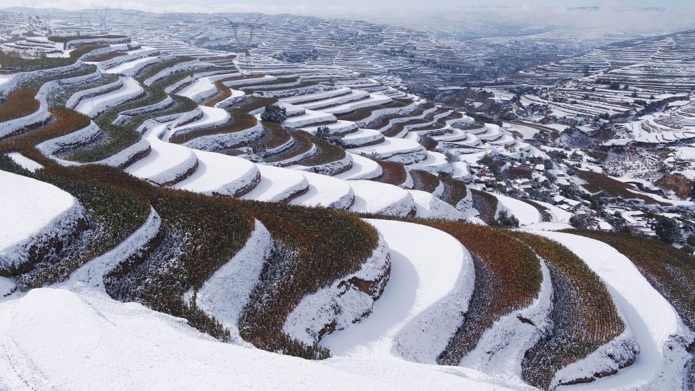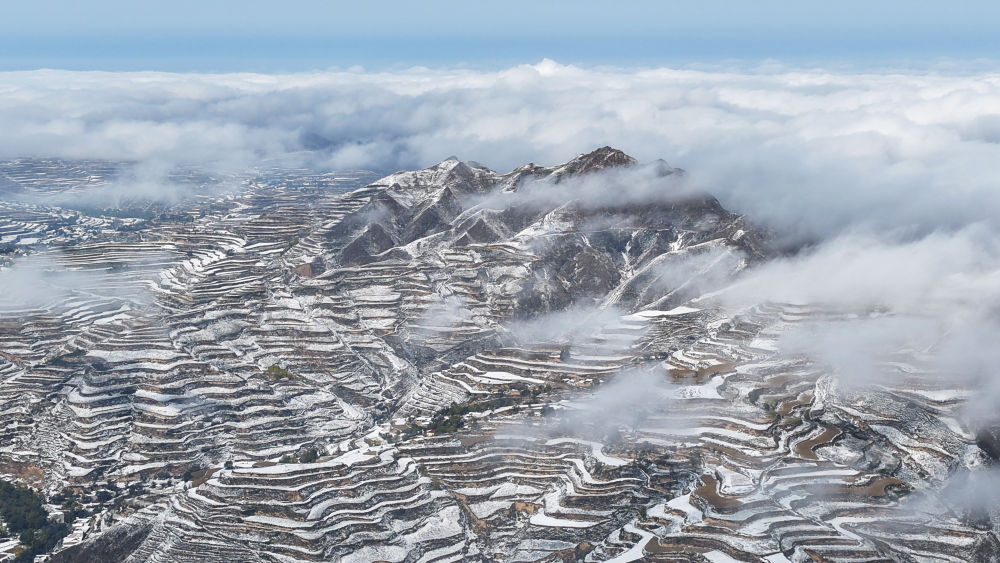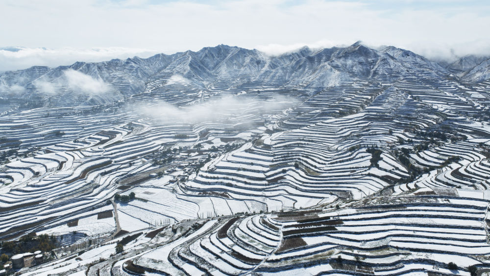 ↑ 这是10月17日在甘肃永靖县陈井镇拍摄的雪后梯田(无人机照片)。新华社发(史有东 摄)