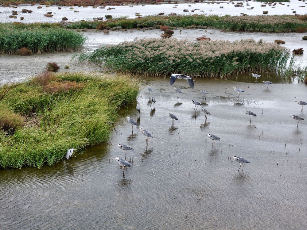 ↑ 10月18日,一群候鸟在江苏省连云港市海州湾国家级海洋公园湿地栖息、觅食(无人机照片)。新华社发(王春 摄)