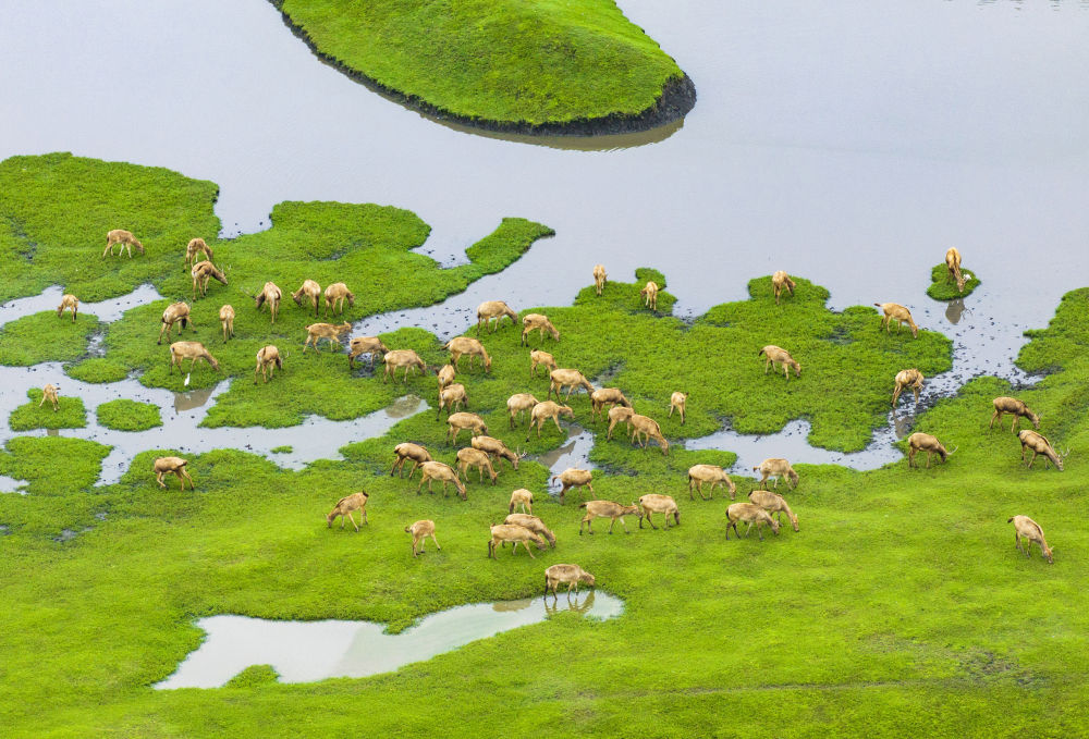 ↑ 10月17日,在江苏省泰州市姜堰区溱湖国家湿地公园,一群麋鹿在栖息、觅食(无人机照片)。新华社发(周社根 摄)