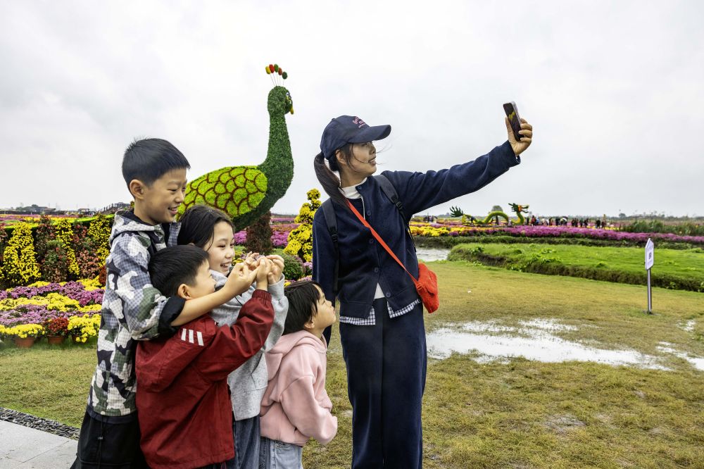 ↑ 10月18日,游客在云南省昆明大观公园内拍照打卡。新华社发(郑益 摄)