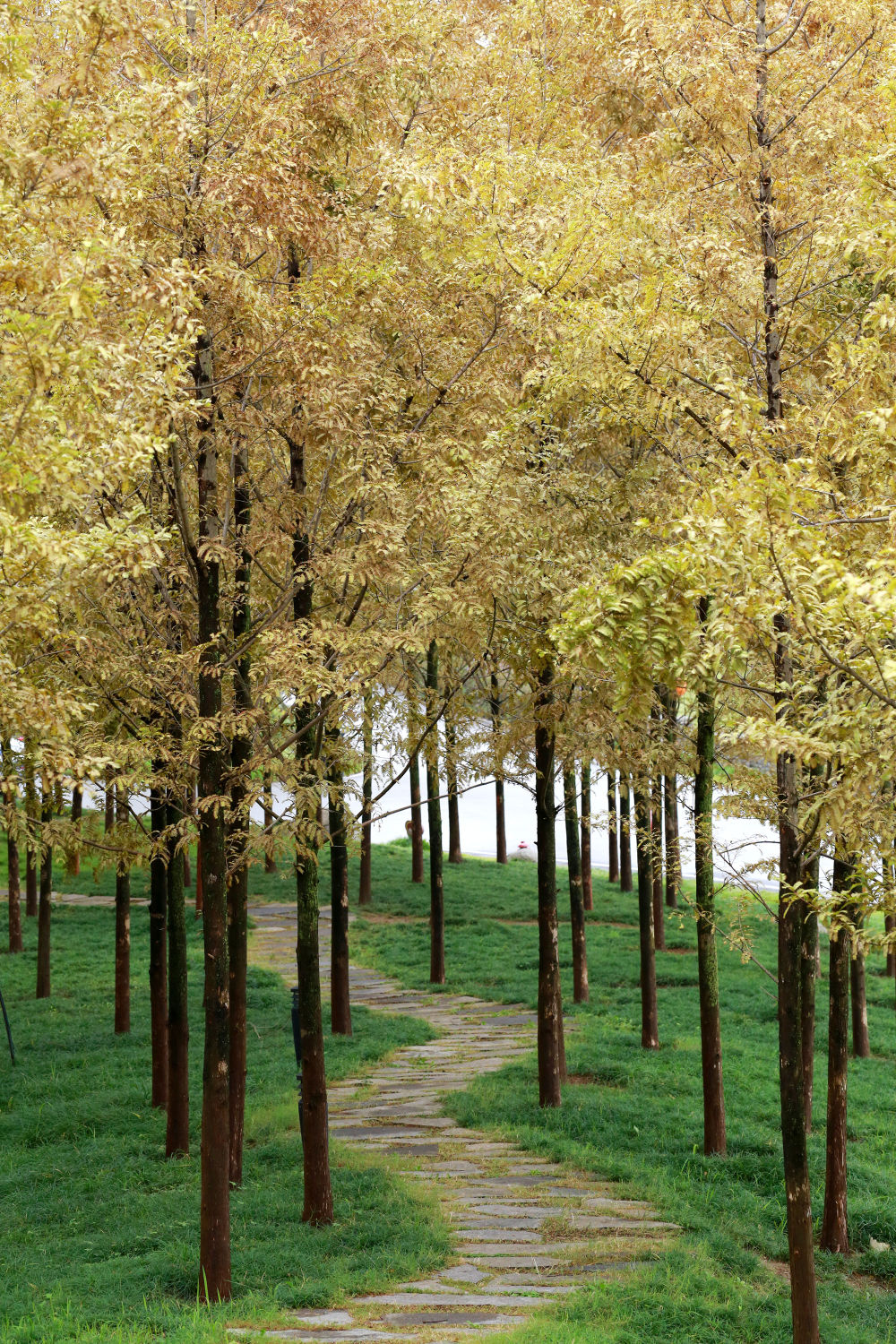 ↑ 10月17日,游人在南京明孝陵景区石象路赏景游玩(无人机照片)。新华社发(方东旭 摄)