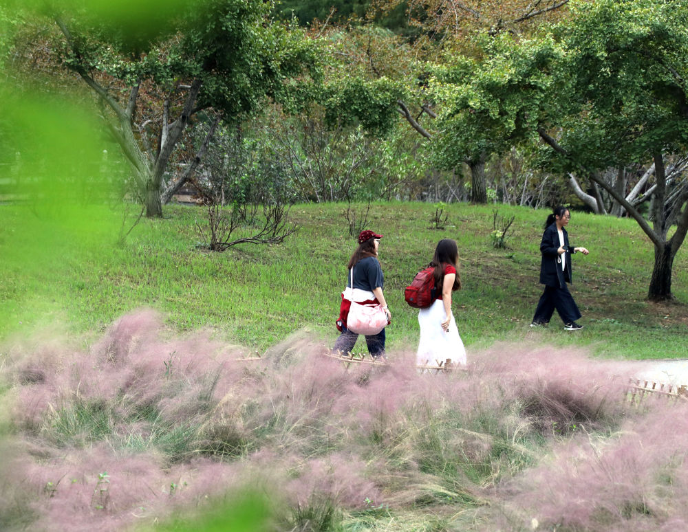 ↑ 10月17日,游客在山东省烟台市黄渤海新区海螺广场粉黛花海游玩。新华社发(孙文潭 摄)