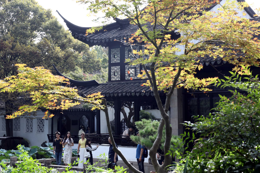 ↑ 10月17日,游客在江苏苏州留园赏景游玩。新华社发(杭兴微 摄)