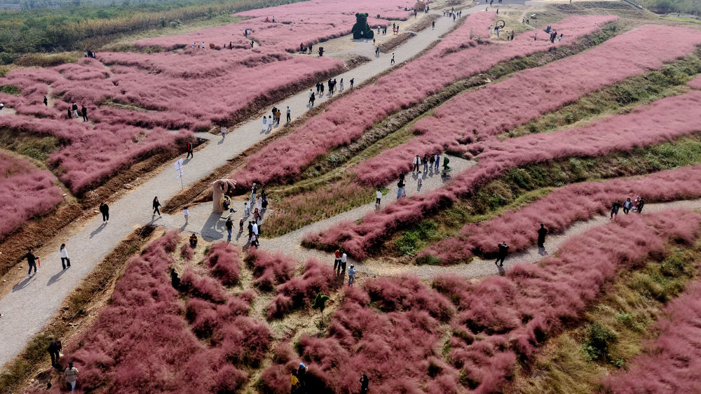 ↑ 10月18日,游客在山东省临沂市平邑县柏林镇粉黛乱子草花田游玩(无人机照片)。新华社发(武纪全 摄)