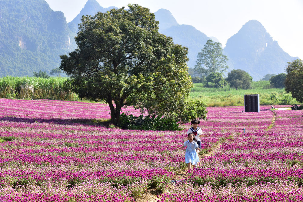 ↑ 10月18日,小朋友在广西崇左市大新县峒那屿湾景区赏花游玩。新华社发(廖祖平 摄)