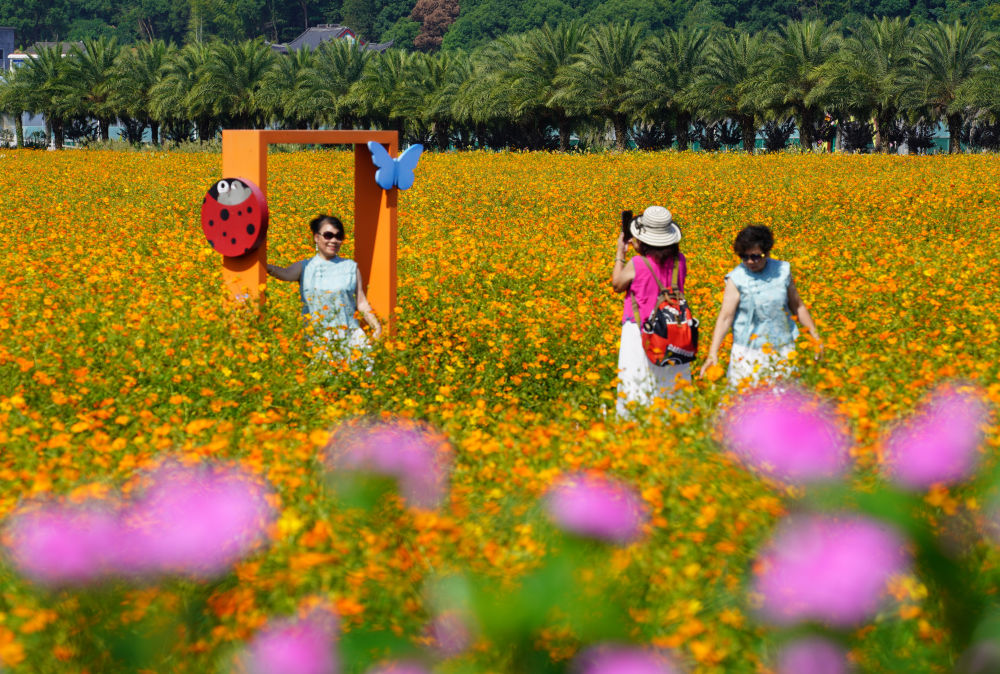 ↑ 10月18日,游客在浙江省乐清市清江镇北塘村赏花拍照。新华社发(蔡宽元 摄)