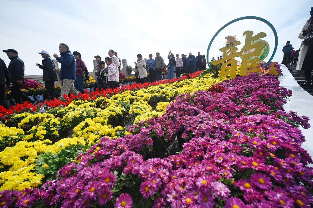↑ 10月18日,游客在河南省开封市龙亭公园内观赏菊花。新华社发(李俊生 摄)