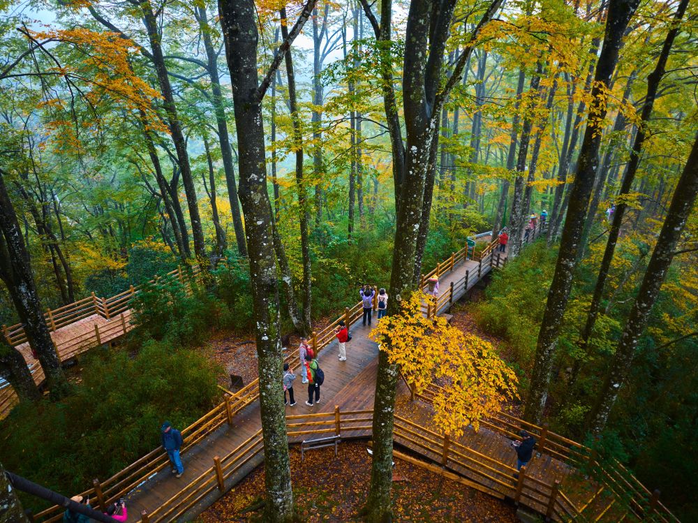 ↑ 10月18日,游客在四川省光雾山风景区的天然画廊畅游。新华社发(付海旭 摄)