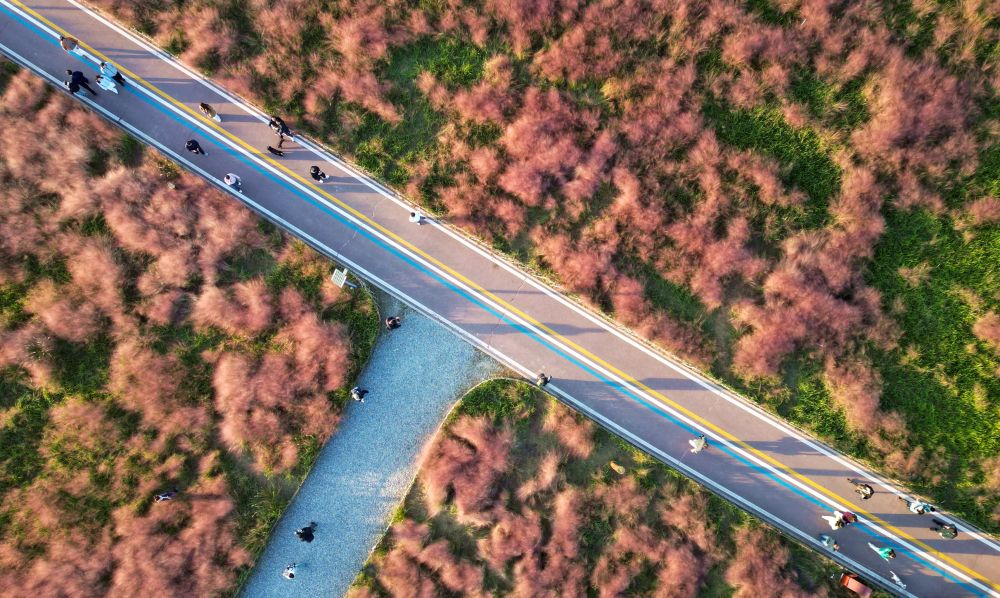 ↑ 10月18日,游客在江苏省兴化市千垛景区赏花游玩(无人机照片)。新华社发(顾继红 摄)