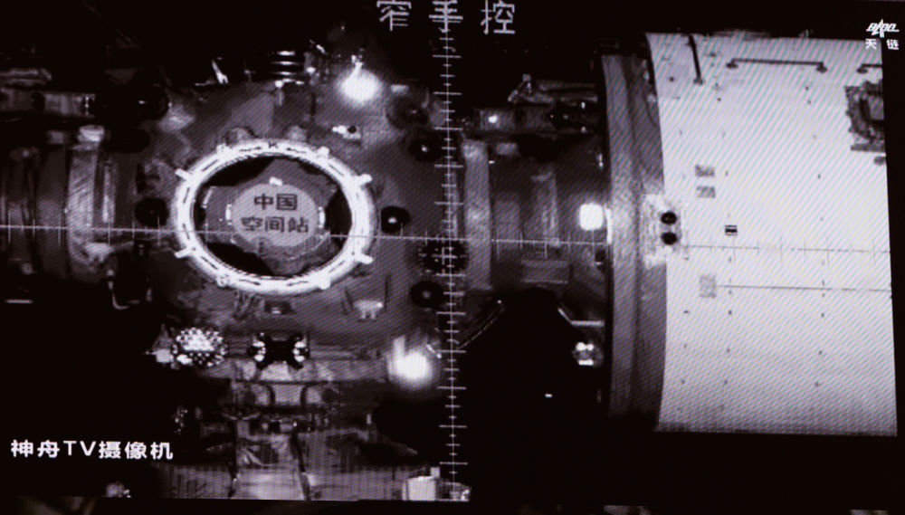 这是11月1日在北京航天飞行控制中心飞控大厅拍摄的交会对接实时画面。